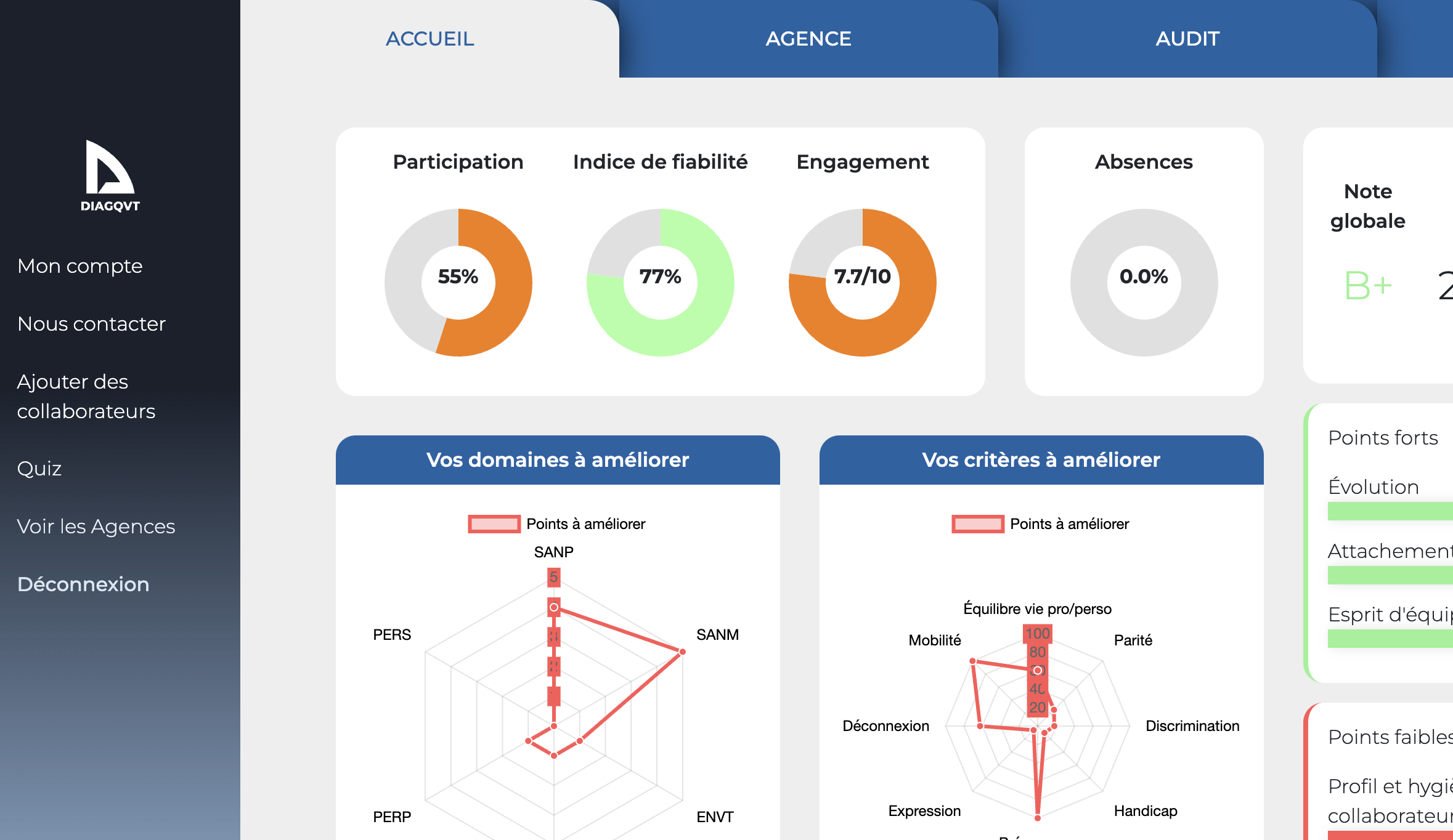 DiagQVT est une solution SaaS complète qui permet aux RH de piloter la Qualité de Vie au Travail de leur entreprise. Via une plateforme web intuitive, vous gérez vos actions QVT, tandis que vos collaborateurs accèdent à une application mobile pour participer aux initiatives bien-être, donner leur feedback et améliorer leur quotidien professionnel.